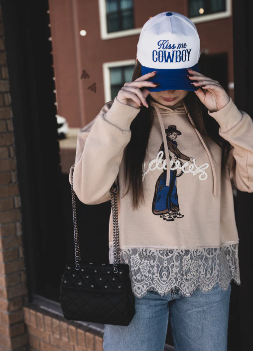 this hoodie has SUPER SOFT sweatshirt material with a some added lace at the bottom....