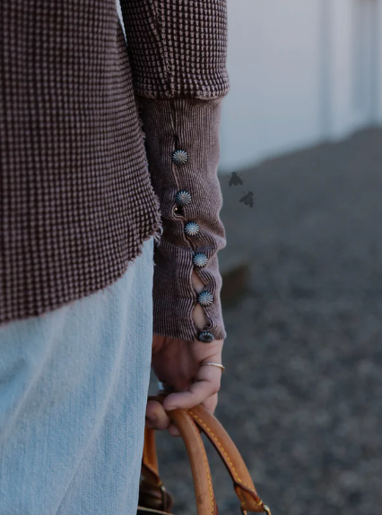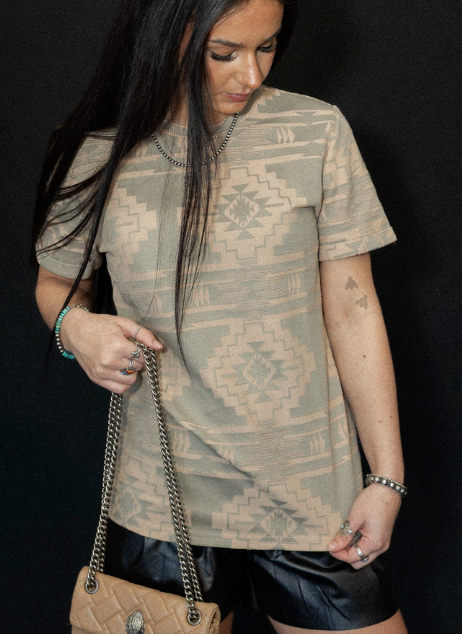 Stunning black polo featuring a cream and tan aztec design for a touch of southwestern...