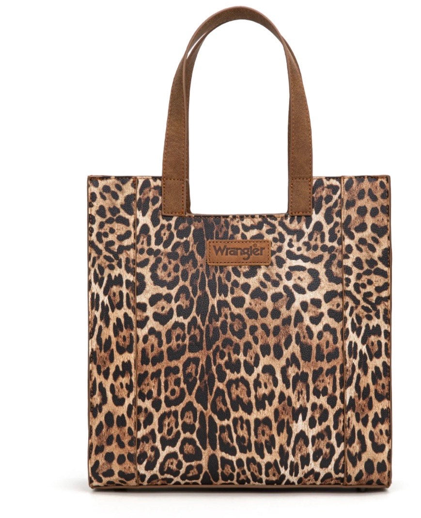 Leopard Print. Wrangler logo applique on the front. Top zipper closure. Inside of the bag includes a zippered...