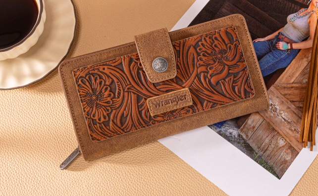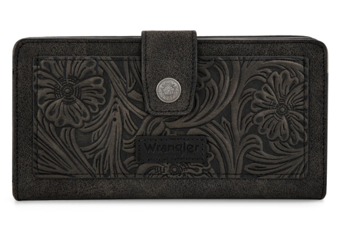 Wrangler wallet featuring a floral tooled design. Available in coffee, brown and black